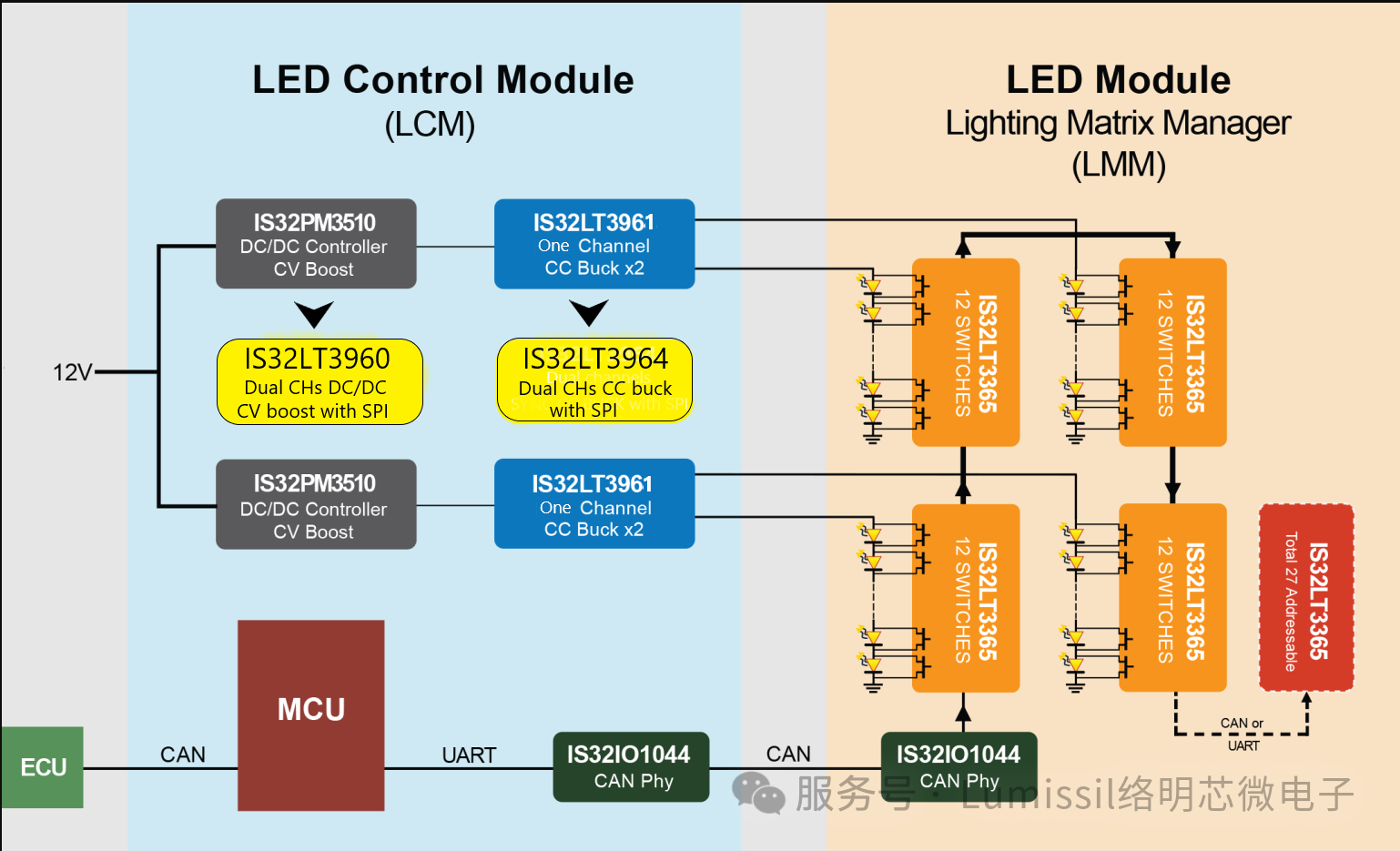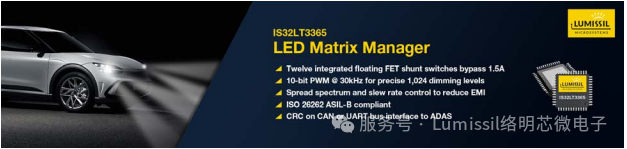 ? ? ? 絡明芯10多年來專注于汽車照明芯片設計開發,擁有豐富的車內車外照明解決方案,已經量產并推出超60款芯片。針對ADB系統應用,已經量產了前級的升降壓電壓轉換器 IS32PM3510、降壓 LED 恒流驅動器 IS32LT3961,以及 CAN 收發器 IS32IO1044 等產品。最新推出的矩陣管理芯片IS32LT3365,使絡明芯能夠提供完整的ADB解決方案。后續,絡明芯將推出符合功能安全ASIL-B的雙路帶 SPI 接口升降壓恒壓控制器 IS32LT3960 和雙路 1.6A 帶 SPI 接口同步降壓恒流驅動器IS32LT3964,為客戶提供更全面、更豐富的汽車照明解決方案。