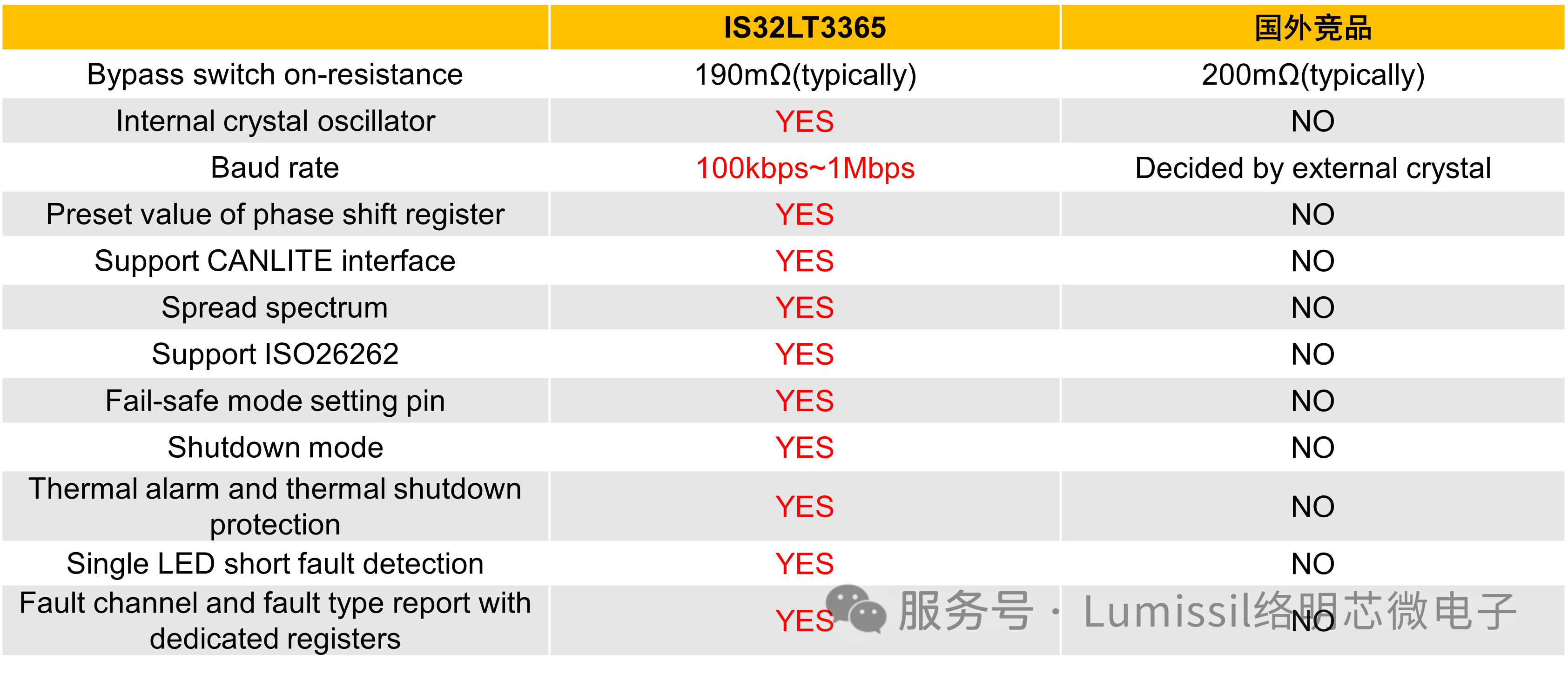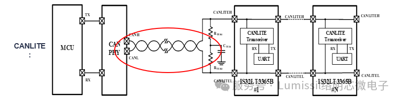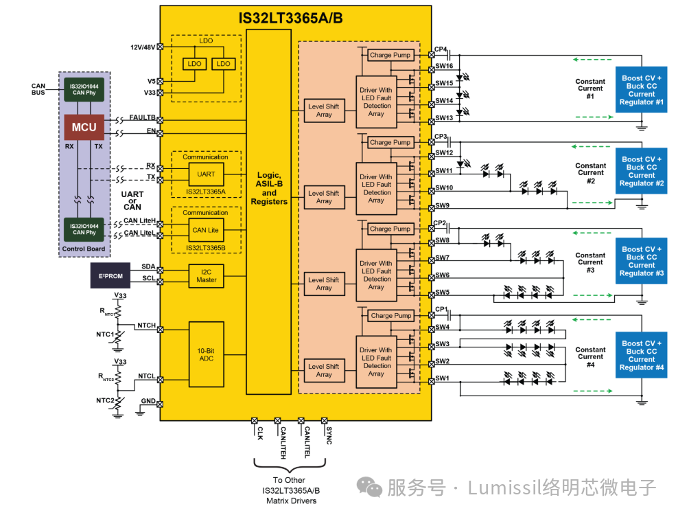 接口類型:支持Lumibus協議的UART(IS32LT3365A) 和 CANLITE (IS32LT3365B) 兩種通信接口可選。IS32LT3365B內部集成了一個 CANLITE 收發器,CANLITE 接口兼容大多數標準的 CAN 收發器(CAN PHY),能夠更好地融入汽車的通信架構,實現與車輛其他系統的高效協同。CANLITE 接口具有出色的電磁干擾(EMI)和電磁抗擾度(EMS)性能,能夠實現長距離的跨板通信。